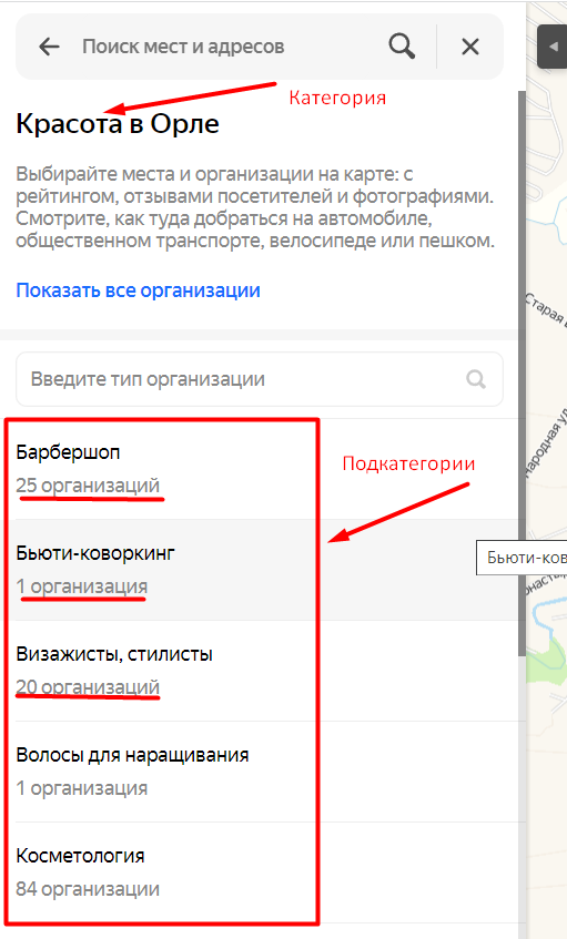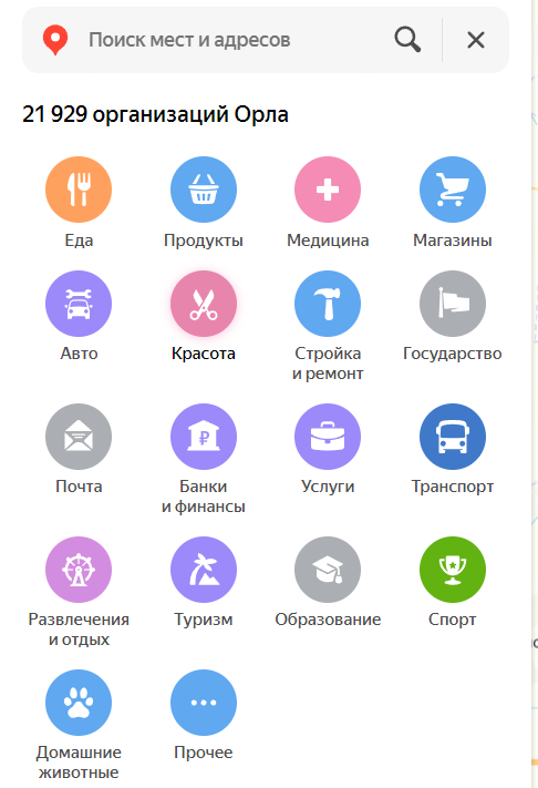 - Красота ( 5 ) : https://yandex.ru/maps/10/orel/catalog/5/?ll=36.069100%2C52.955841&z=13
