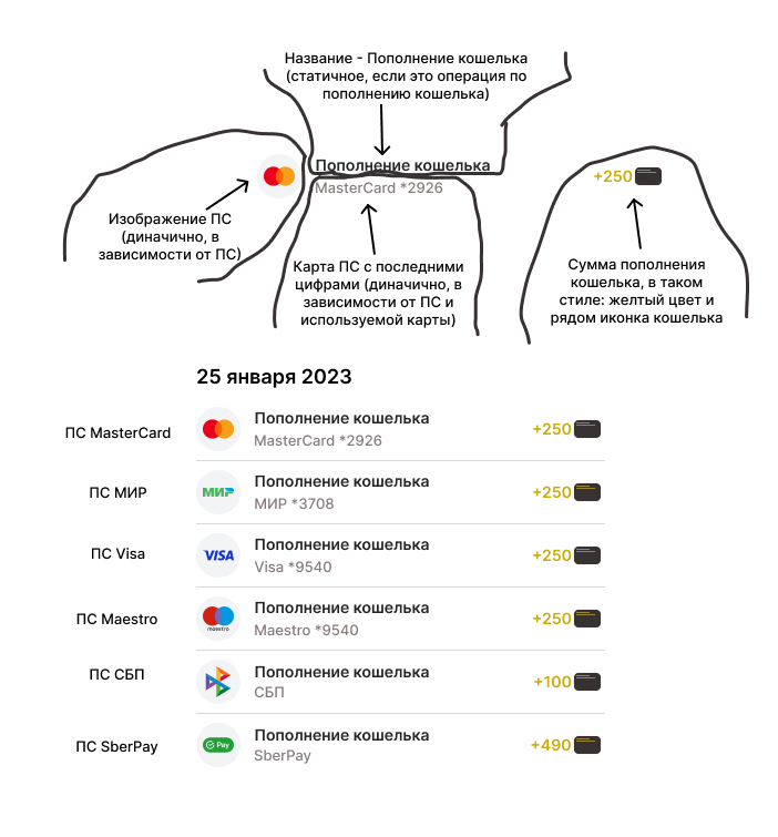 На изображении ниже, есть пример в котором разобран пункт из истории с пополнением кошелька