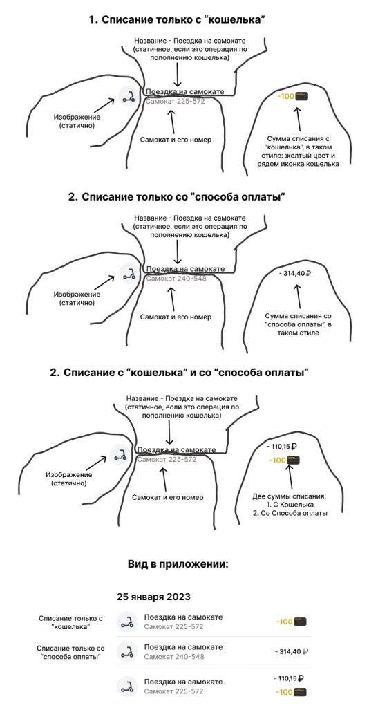 На изображении ниже, есть пример в котором разобран пункт из истории с оплатой поездки. На нём отличается только вывод суммы списаний
