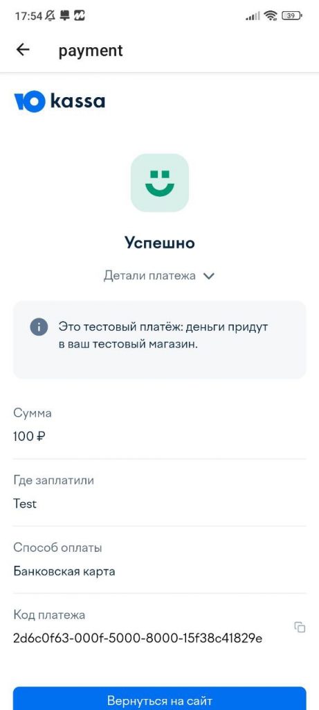 Банковская карта: при выборе данного метода в мобильном приложении открывается экран и в нем отображается браузерный интерфейс yoomoney посредством компонента <WebView source={{ uri: ‘ссылка на оплату’ }}> в который передается ссылка для оплаты (uri). Соотвественно в этом интерфейсе пользователь вводит данные карты, производит разовую оплату и мы сохранем paymentId карты в БД.