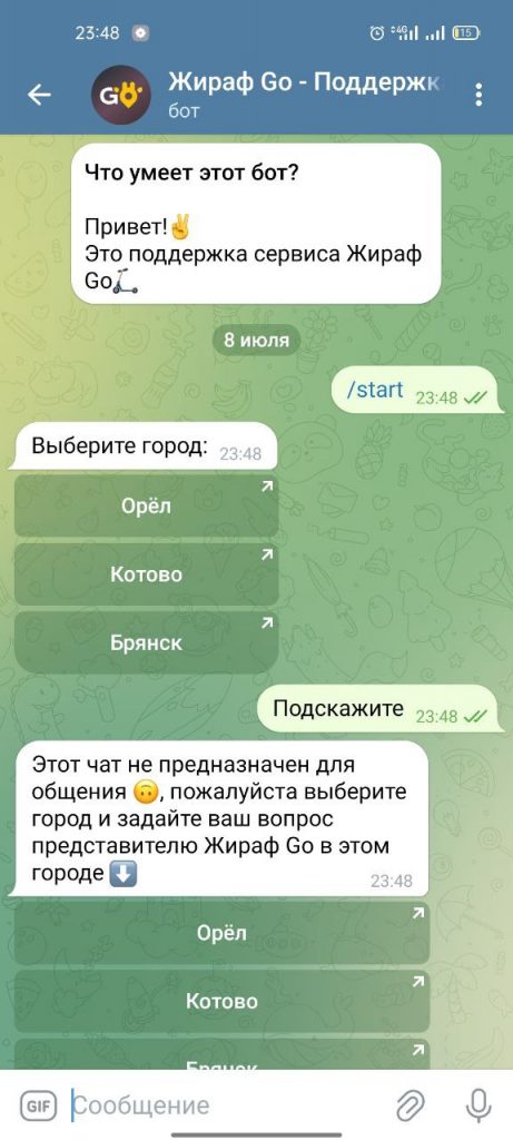 'Этот чат не предназначен для общения, пожалуйста выберите город и задайте ваш вопрос представителю Жираф Go в этом городе.',